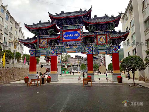 为重庆清水乡民族广场牌楼制作的油漆彩绘,旋子彩绘。